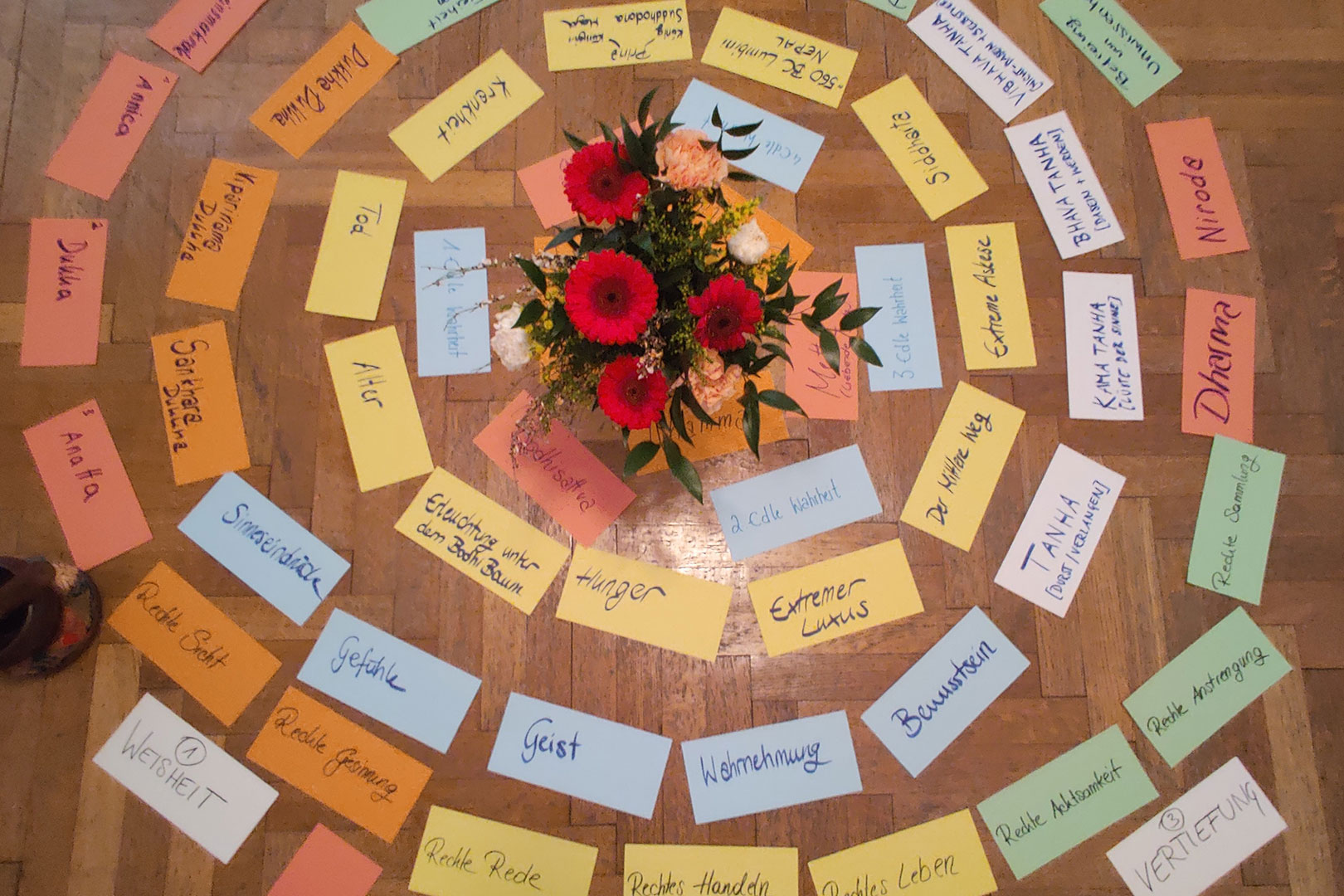 In diesem Sinne praktizieren wir gerne heilsame Mantras und neben Sitzmeditation auch Gehmeditation. Wir schaffen einen gemeinsamen Raum, in dem wir zur Ruhe kommen können und die Aufmerksamkeit nach Innen kehren, um uns der Wahrheit über die Realität der Dinge anzunähern. Alle sind willkommen, diesen Raum mitzugestalten und in einen friedlichen Austausch miteinander zu treten.
