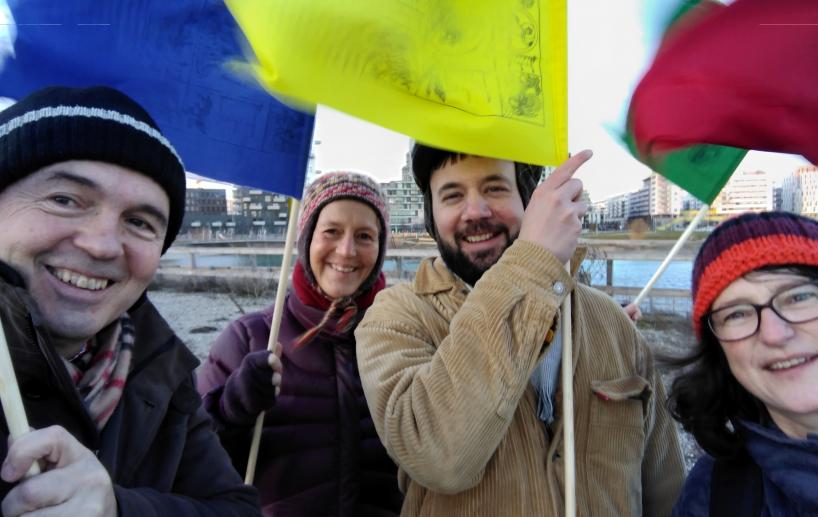 Eine Gruppe von Schüler*innen von Sakyong Mipham Rinpoche beging die Neujahrseröffnung mit einem traditionellen Lhasang, einer Rauchzeremonie, bei der Himmel und Erde verbunden und frische Energien erweckt werden. Der kalte und stürmische Morgenwind ließ die Fahnen heftig flattern – genau richtig für eine Zeremonie nach tibetischem Ritual. Möge der frische Wind auch auf die Entwicklungen zum Campus der Religionen positiv wirken!